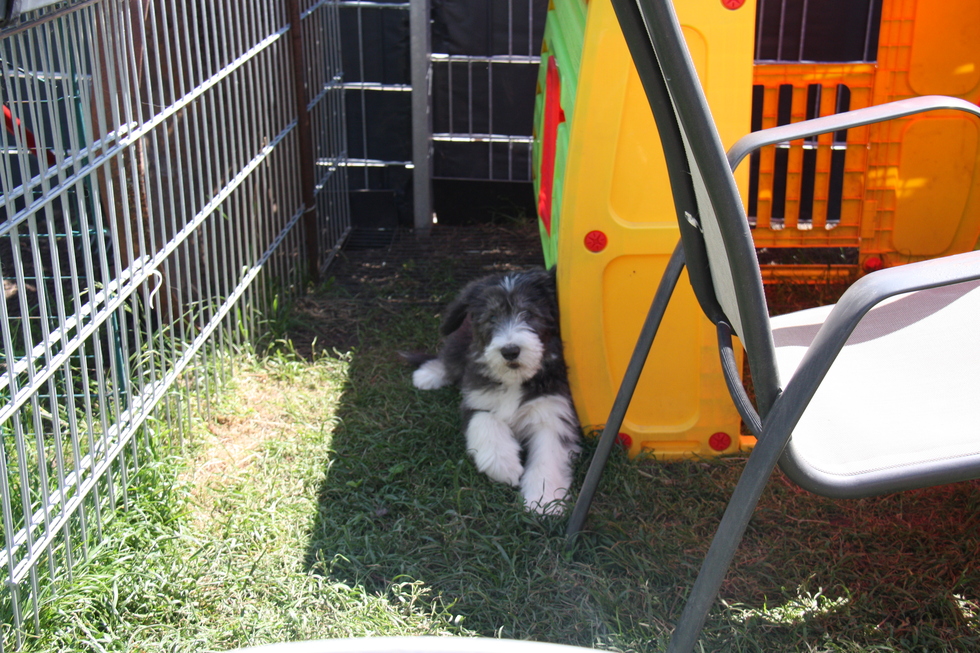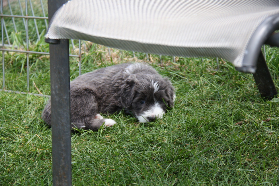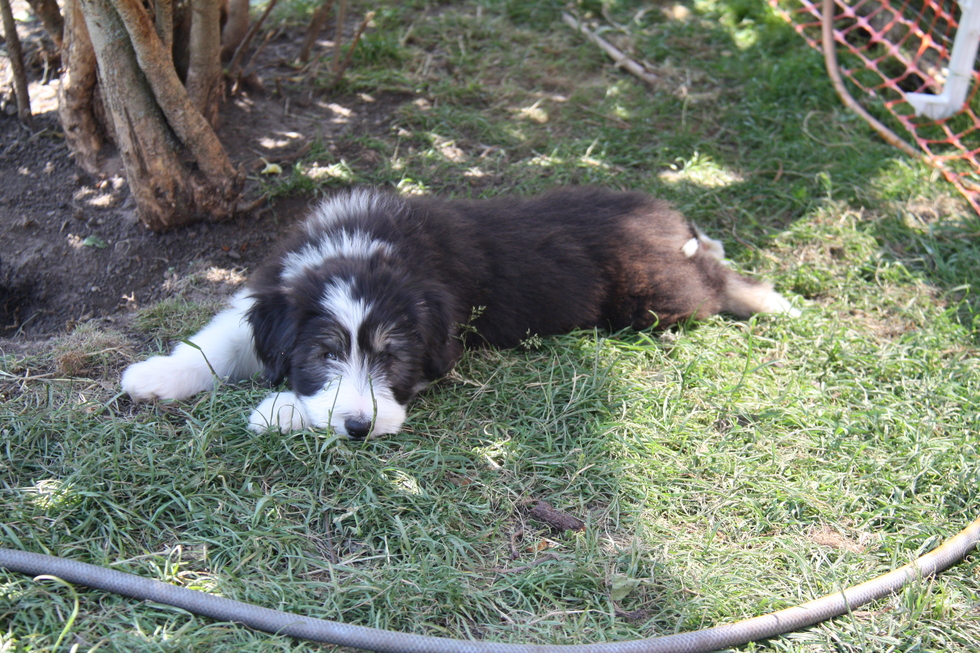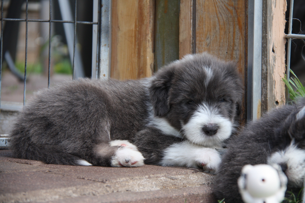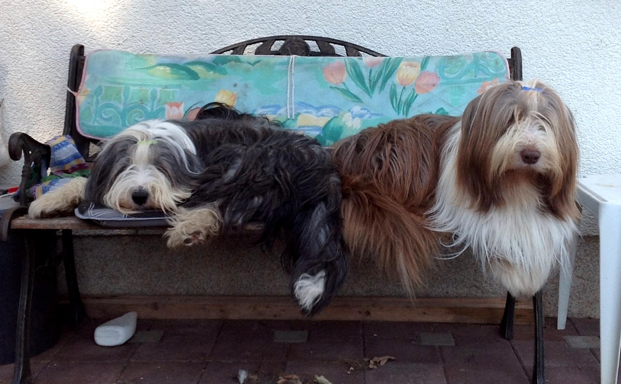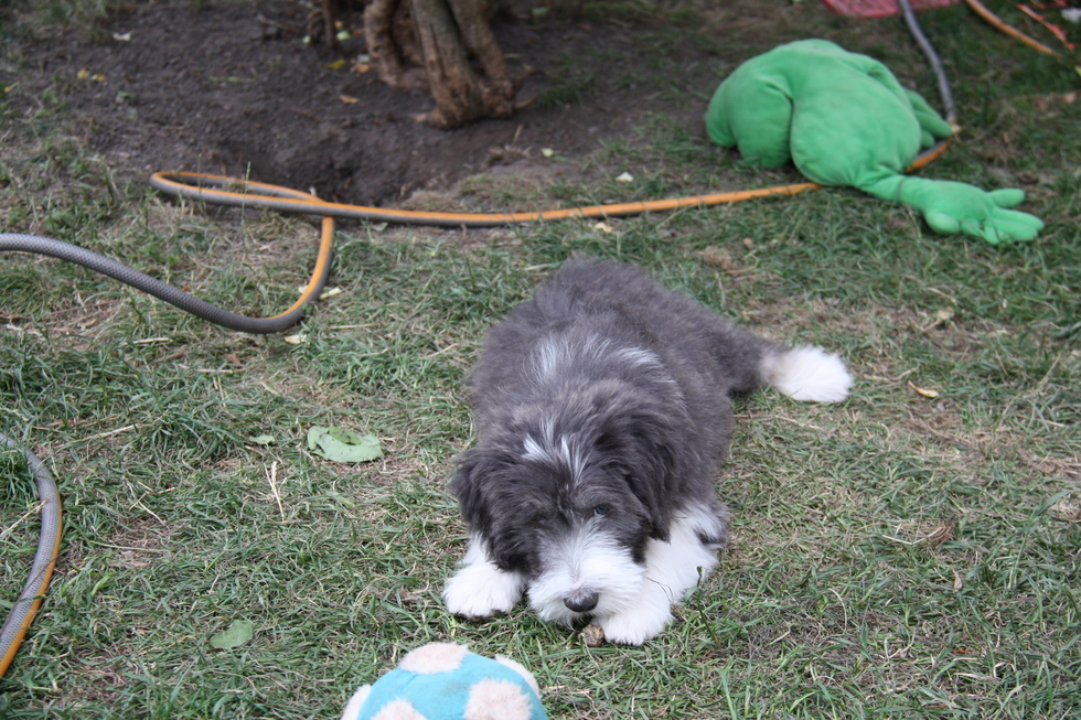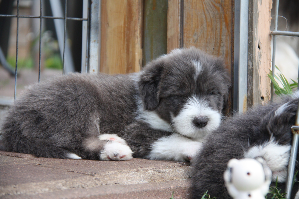 Wir machen mit unseren erwachsenen Beardies ab und zu eine kleine Radtour zum See oder übers Feld, danach sind sie alle platt und wollen nur noch schlafen. Ein erwachsener Hund sollte mindestens eineinhalb bis zwei Stunden am Tag draußen sein dürfen und mit Herrchen oder Frauchen toben, mit Artgenossen macht spielen nochmal so viel Spass.