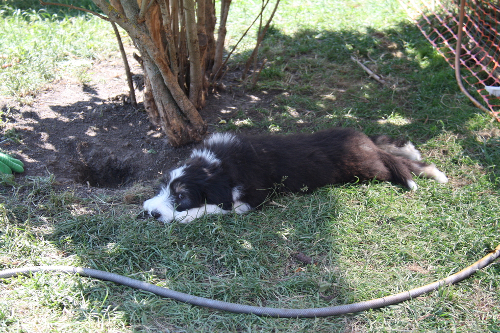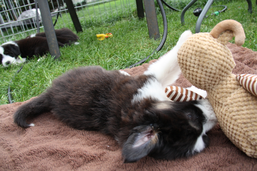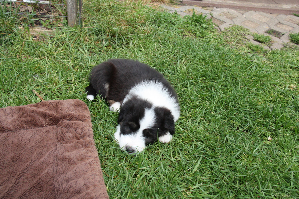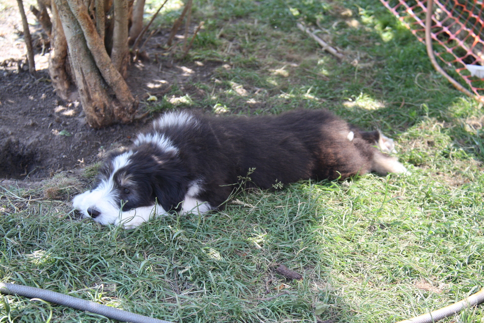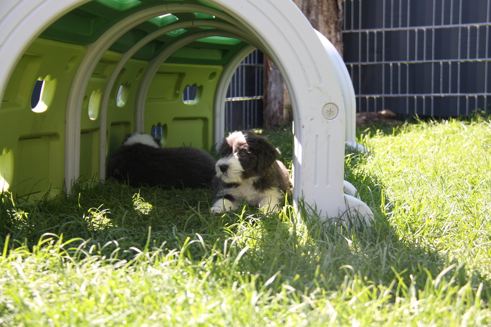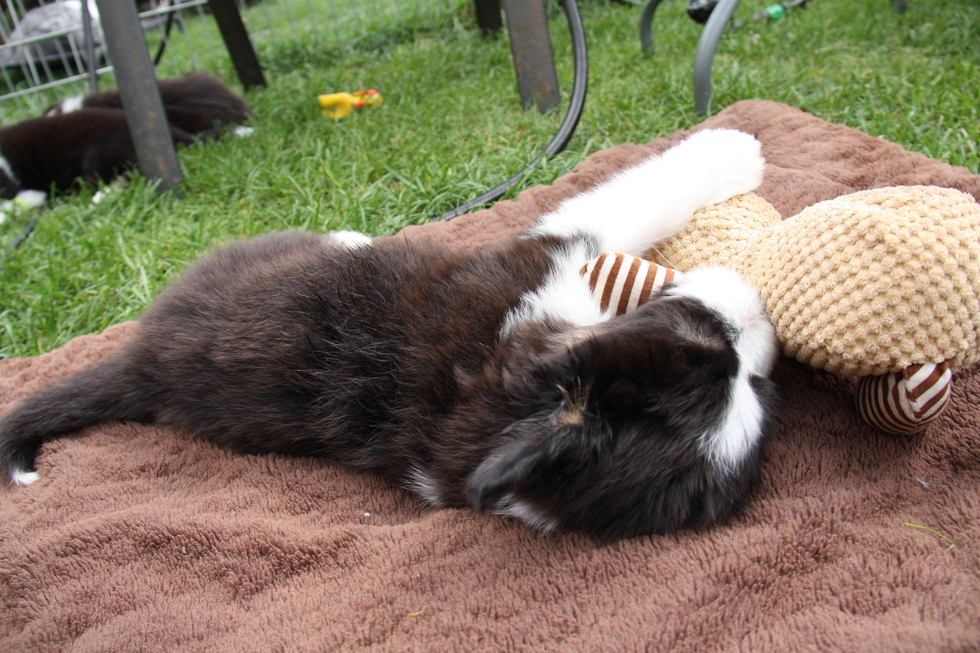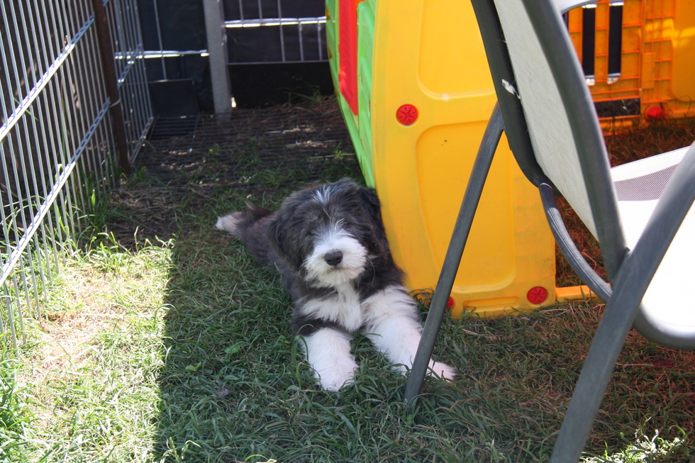 Wir machen mit unseren erwachsenen Beardies ab und zu eine kleine Radtour zum See oder übers Feld, danach sind sie alle platt und wollen nur noch schlafen. Ein erwachsener Hund sollte mindestens eineinhalb bis zwei Stunden am Tag draußen sein dürfen und mit Herrchen oder Frauchen toben, mit Artgenossen macht spielen nochmal so viel Spass.