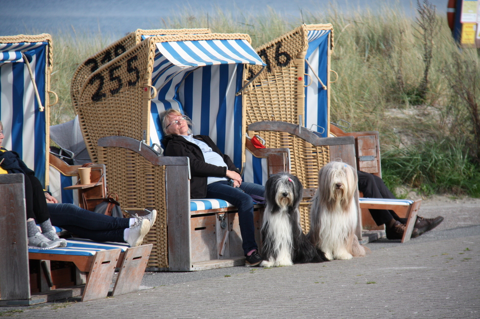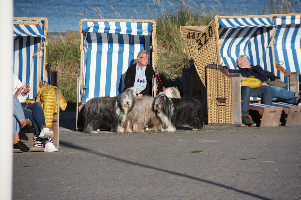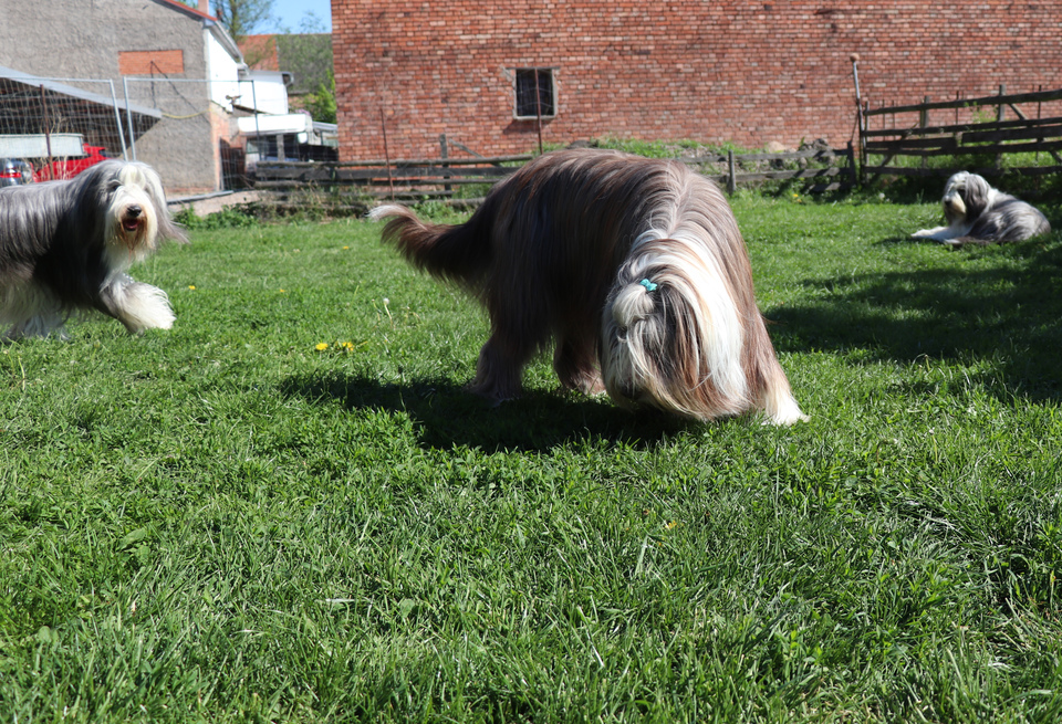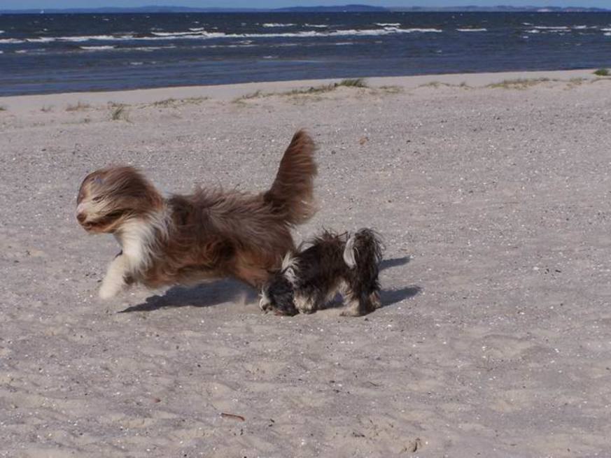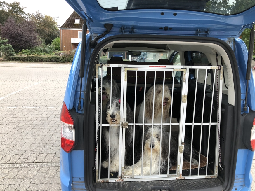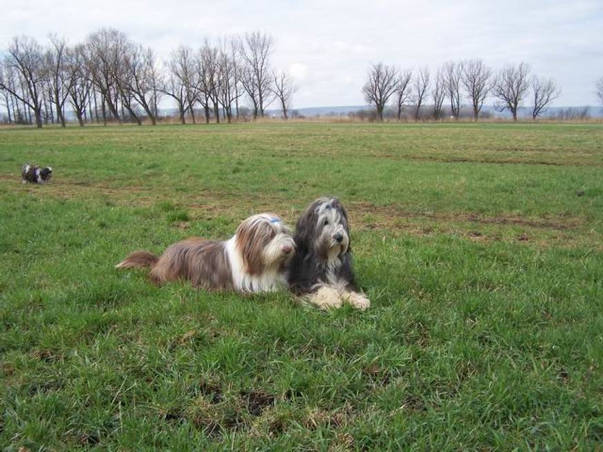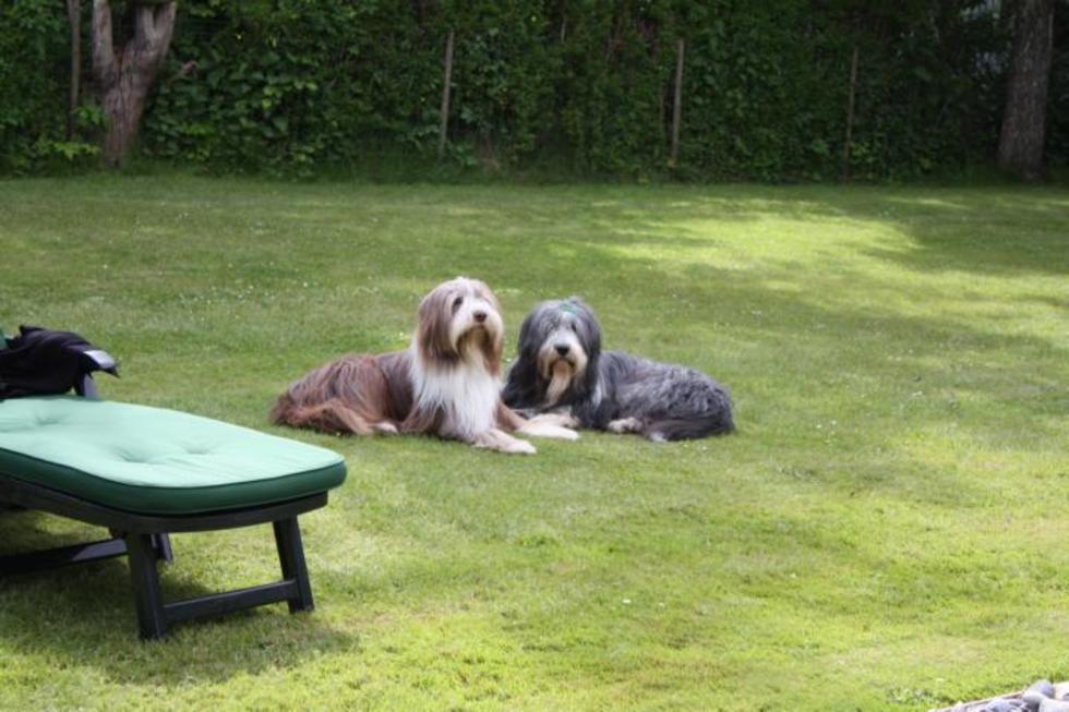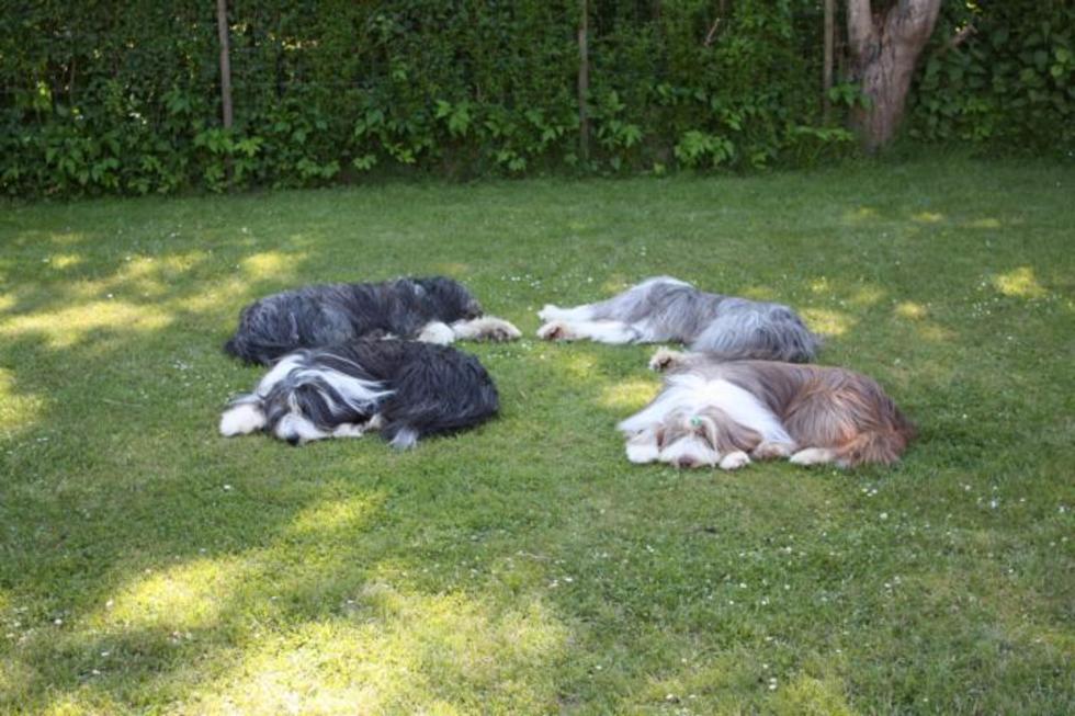 Wir machen mit unseren erwachsenen Beardies ab und zu eine kleine Radtour zum See oder übers Feld, danach sind sie alle platt und wollen nur noch schlafen. Ein erwachsener Hund sollte mindestens eineinhalb bis zwei Stunden am Tag draußen sein dürfen und mit Herrchen oder Frauchen toben, mit Artgenossen macht spielen nochmal so viel Spass.