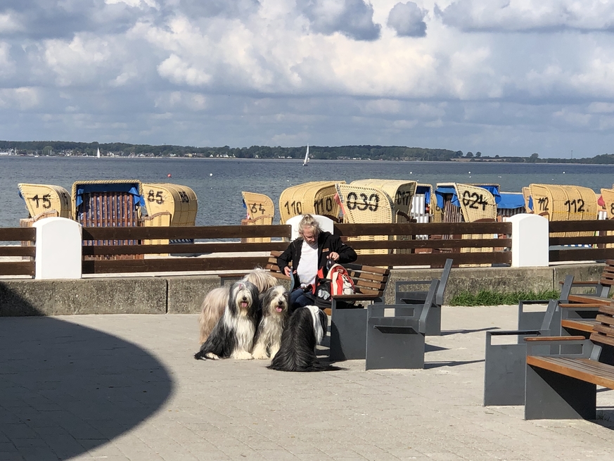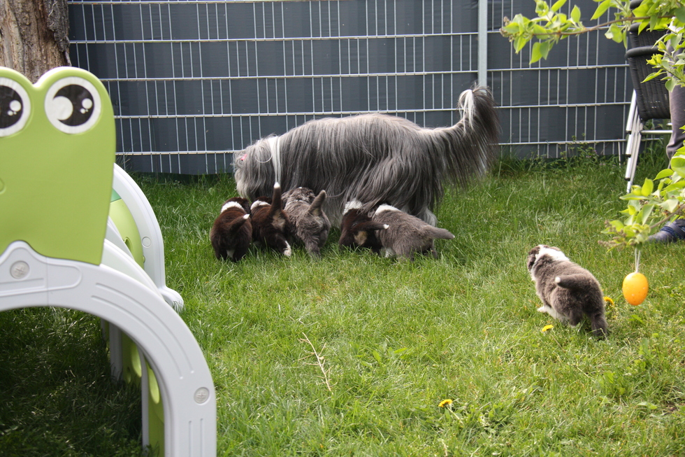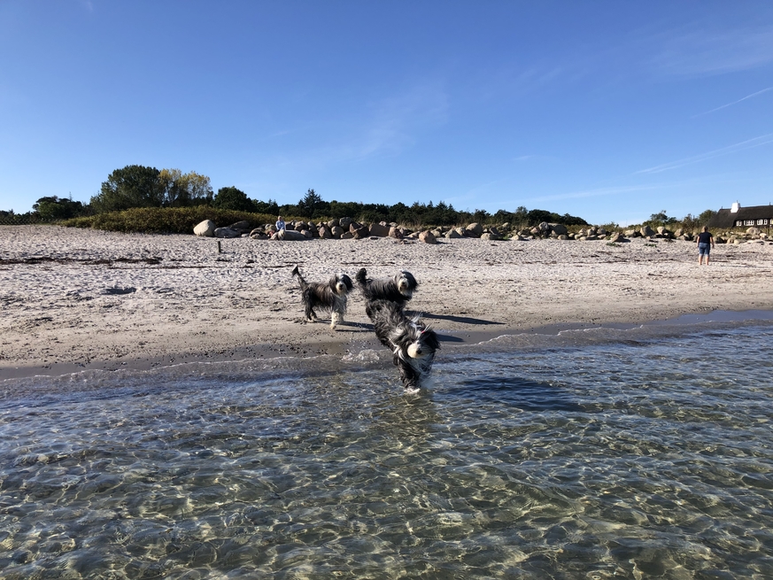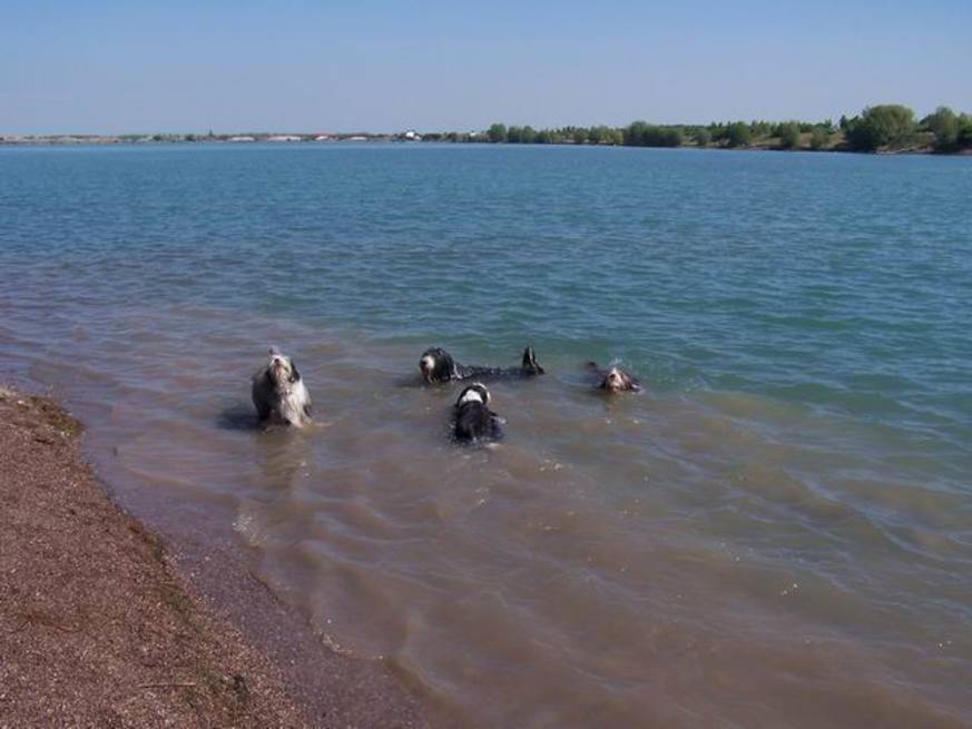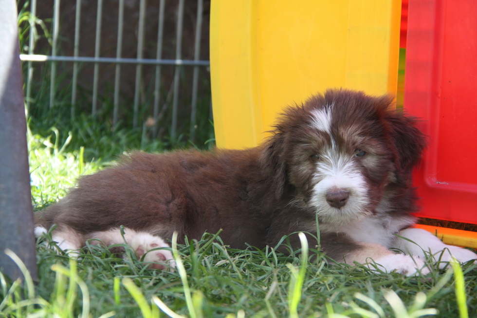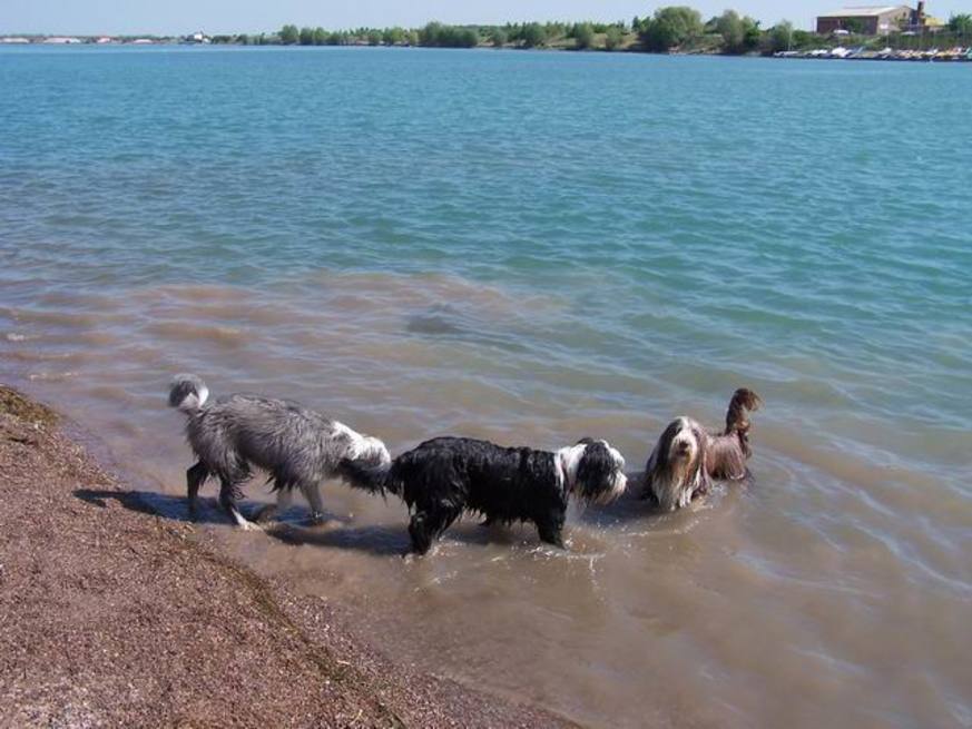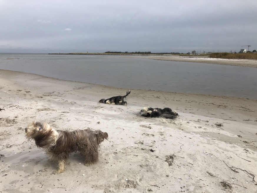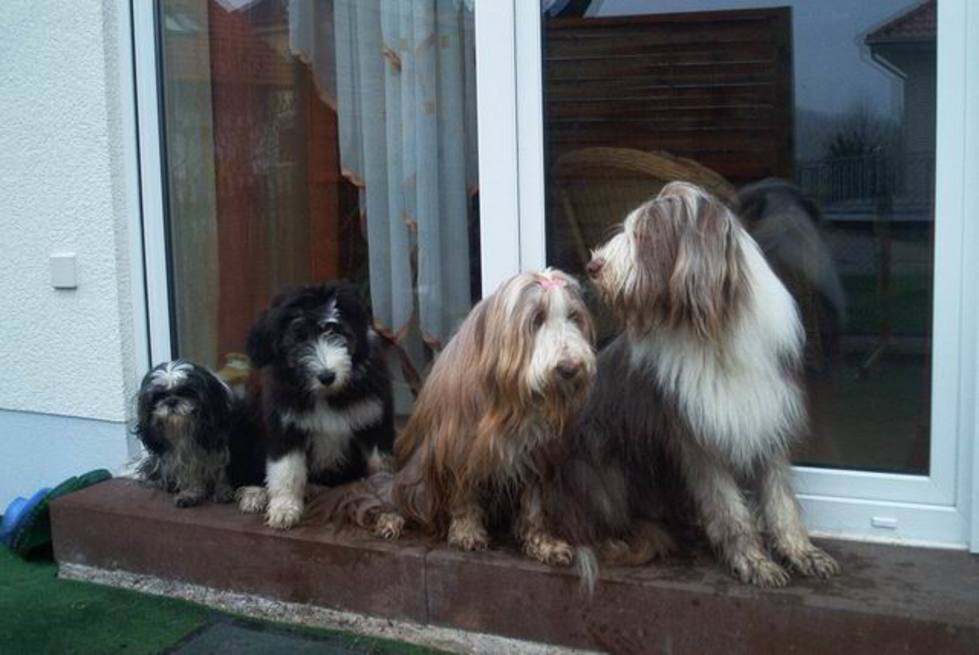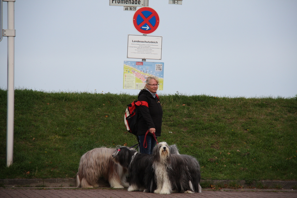 Wir machen mit unseren erwachsenen Beardies ab und zu eine kleine Radtour zum See oder übers Feld, danach sind sie alle platt und wollen nur noch schlafen. Ein erwachsener Hund sollte mindestens eineinhalb bis zwei Stunden am Tag draußen sein dürfen und mit Herrchen oder Frauchen toben, mit Artgenossen macht spielen nochmal so viel Spass.